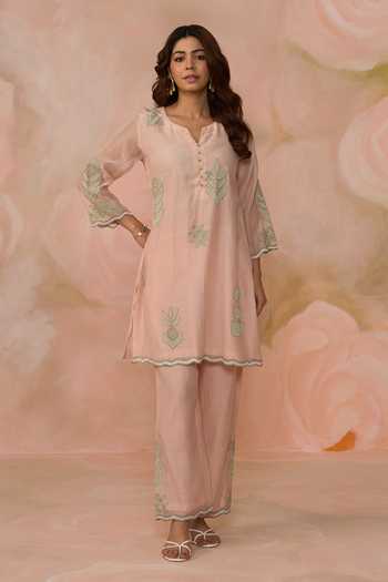 Pink Chanderi kurta with geometric patchwork and delicate beadwork. Paired with pant.