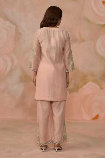 Pink Chanderi Split V-neck Hand Embroidered Kurta And Pant Set