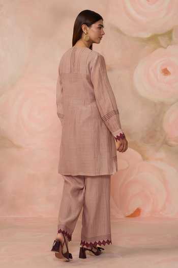 Grey Chanderi kurta with contrasting geometric patchwork & delicate beadwork. Paired with a pant and slip.