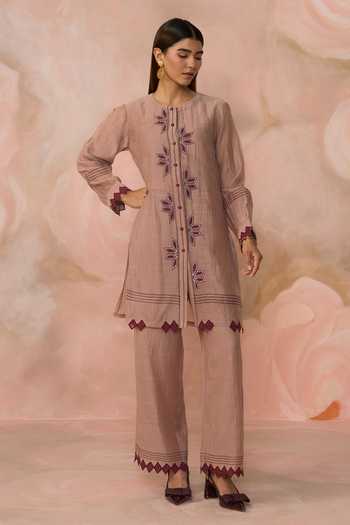 Grey Chanderi Round Neck Hand Embroidered Kurta And Pant Set