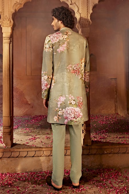 Mint green floral pattern sherwani featuring tonal thread embroidery and mandarin neckline. Paired with coordinated tonal straight pant, both designed for a relaxed fit.