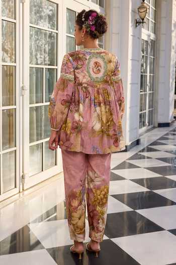 Pink Cotton Embroidery V-neck Anaisha Floral Print Top And Pant Set
