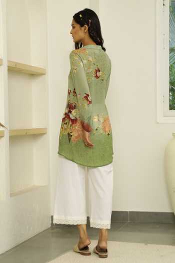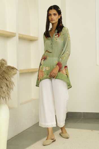 Mint green high-low tunic in vintage floral, bird print & puff sleeves. Paired with straight-fit lace detailed flared pant.