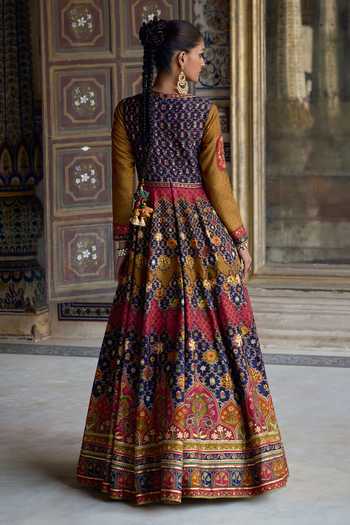 Multi color Anarkali featuring full sleeves, round neckline & Persian floral embroidery. Paired with a mustard yellow embroidered dupatta.