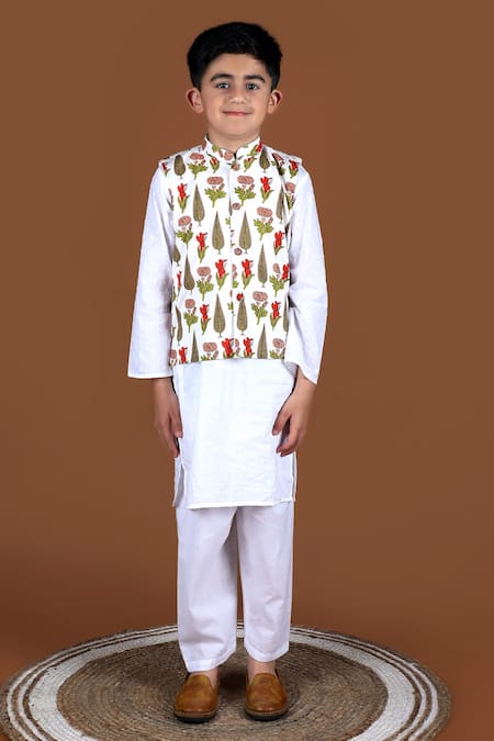 Buy_Kalp_White Cotton Botanical Print Bundi And Kurta Set _at_Aza_Fashions