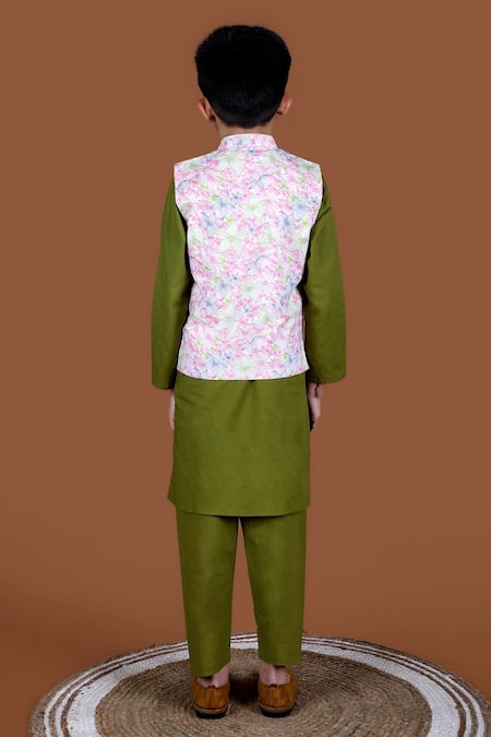 White bundi featuring floral print and mandarin collar. Paired with olive kurta and pant, the set includes full sleeves for the kurta and a sleeveless bundi.