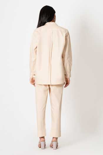 Beige full cuff sleeves solid shirt with faux flap pocket. Paired with a matching pant.