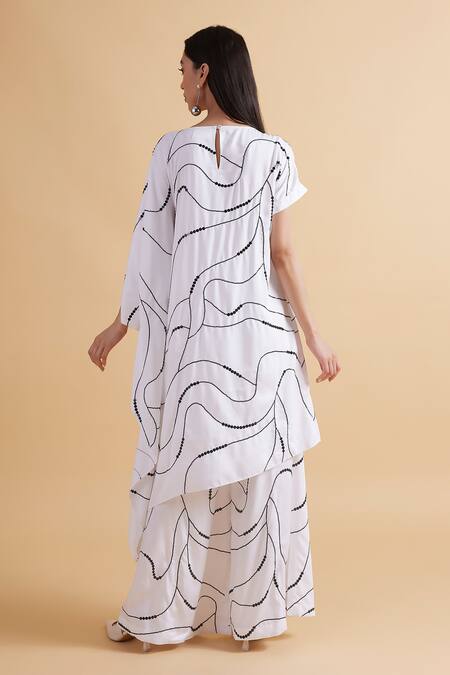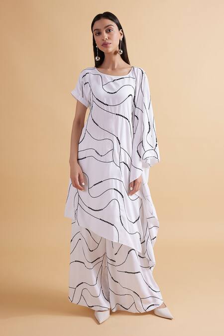 White draped tunic featuring sequin and bead embroidery. Paired with straight pants designed for a relaxed fit.