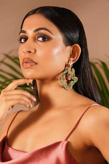 Gold and green snake earrings brought to life with intricate embroidery that mimics a scale-like texture, wrapped in graceful curves and capturing movement and form with exquisite detail. Bold yet refined, a timeless statement.