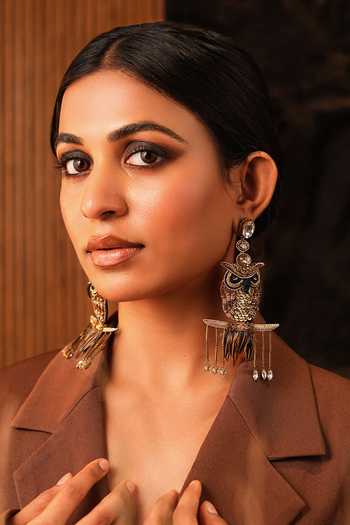 Hand-embroidered owl earrings featuring an owl perched on a golden branch. Intricately crafted with subtle shine and rich detail, these earrings add playful elegance.