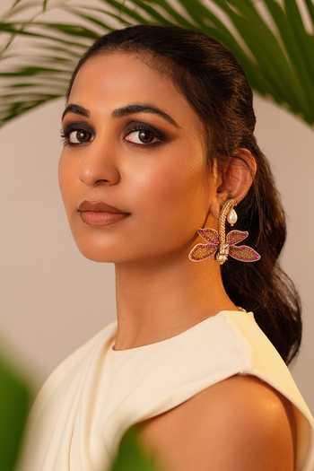 Graceful dragonfly earrings have a sleek embroidered body and long delicate wings. Finished with a large hanging pearl and pink and blue stone accents, the piece blends softness with charm.