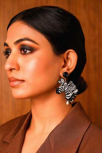 Black and white zebra earrings crafted with glass beads for bold contrast and a thread-detailed mane that adds texture and movement. Finished with subtle crystal accents for a striking, sophisticated look.