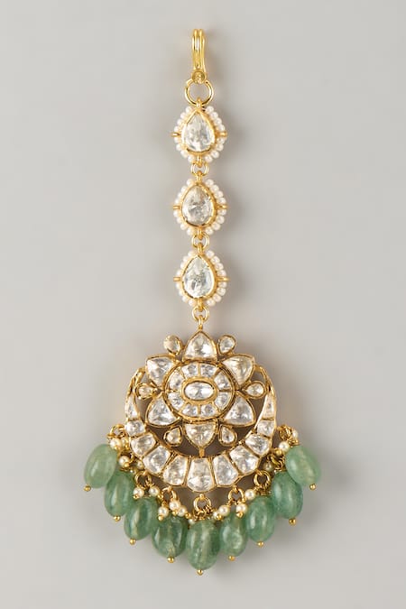 White Beads, Pearls, Stones Aashi Green Drops Maangtikka