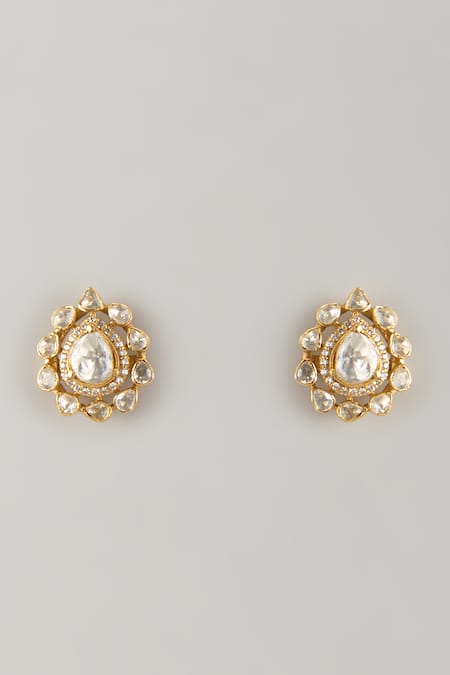Gold-plated stud earrings handcrafted in 92.5 sterling silver with moissanite polkis and cubic zirconia; nickel-free and 925 silver stamped. Lightweight design may include an omega clip for support on heavier pieces and includes a pair of complimentary washers.
