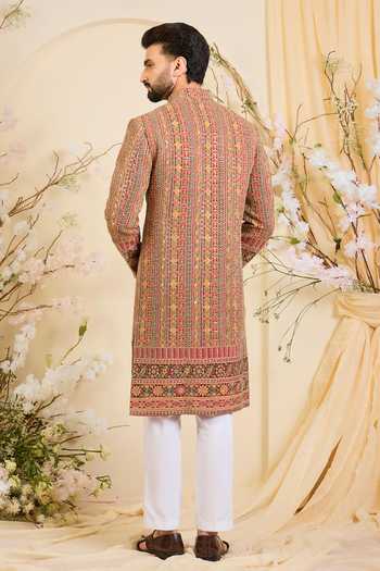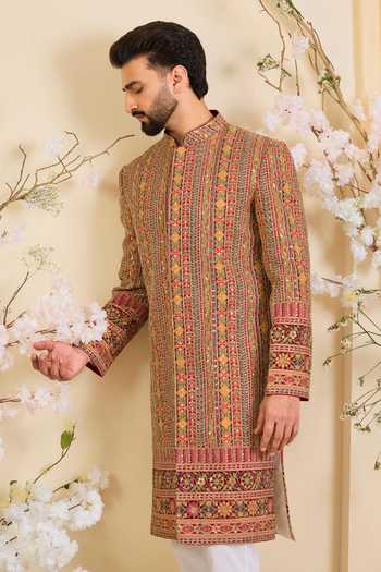 Multi Color crepe sherwani with dense zari embroidery and multicolour sequin work.