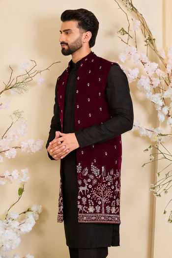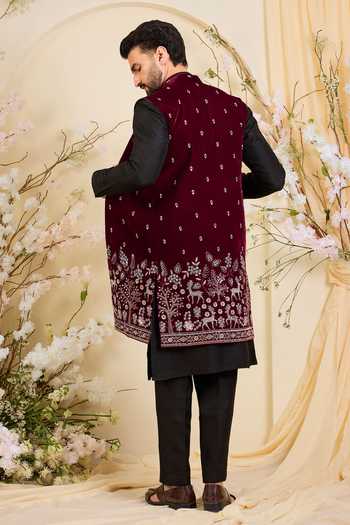 Maroon Nehru jacket with dense cut dana hand-embroidery and intricate flora and fauna motifs. The long open silhouette has a richly textured, jewel-like surface.