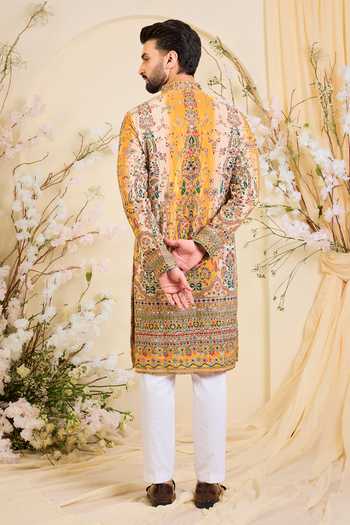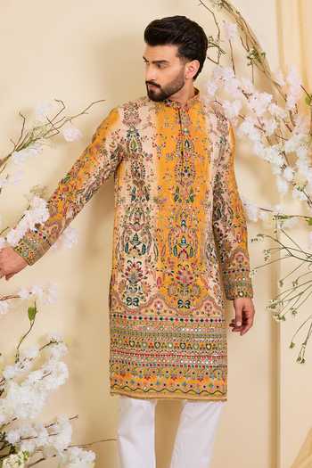 Yellow crepe kurta with multicolour prints and intricate zari and sequin detailing.