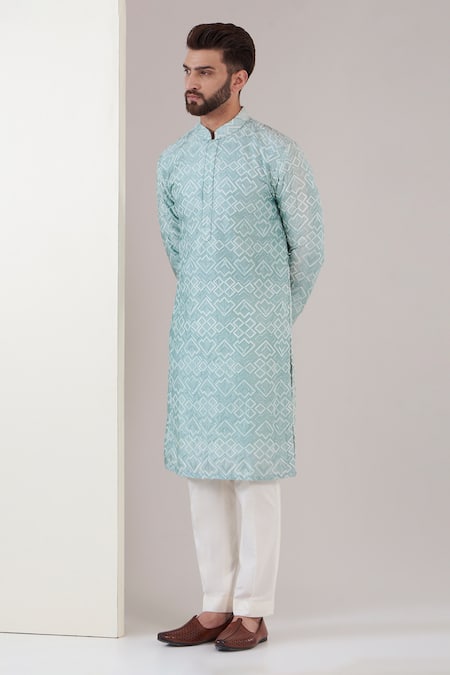 Mint blue kurta featuring geometric chikankari thread embroidered motifs embellished with sequins. Paired with matching pant for a complete look.