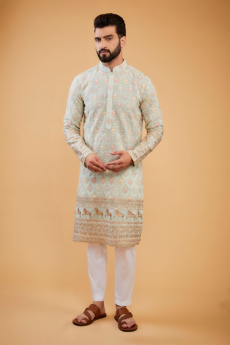 Powder blue kurta featuring multicolor zari and threadwork embroidery in geometric patterns and horse motifs