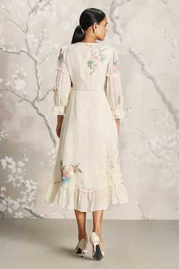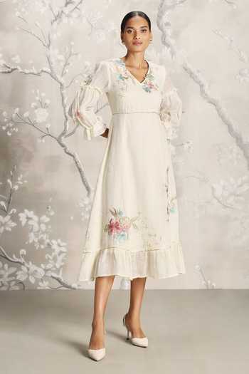 Off white midi dress featuring floral silk embroidery and a ruffled hem