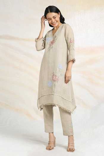 Beige 100% Linen Printed And Embroidered Fly Free Kurta & Pant Set