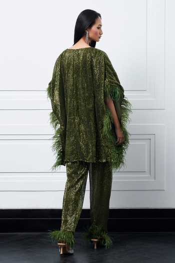 Green Net Sequins, Fringe Round Neck Embroidered Kaftan And Pant Set