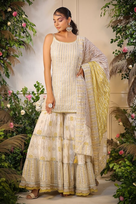 Ivory & mustard mulmul short kurta with stripe pattern khari print, gota embroidery & round neck. Paired with sharara with floral pattern khari print & gota work & dupatta.