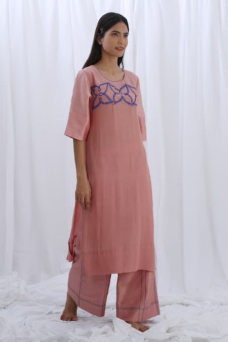 Light pink straight kurta featuring contrast floral embroidery on the yoke. Paired with a matching pant that has piping detailing.