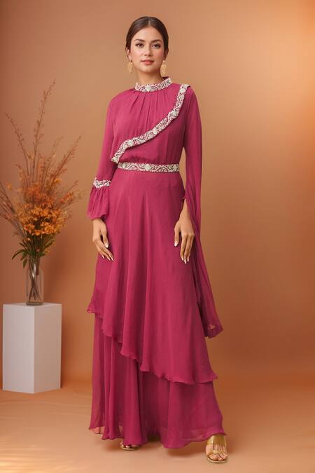 Magenta chinon tunic featuring floral, sequins, and thread embroidery with a high neck and flared sleeves. Paired with a matching skirt and detachable belt, it has an asymmetric hemline and attached lining.