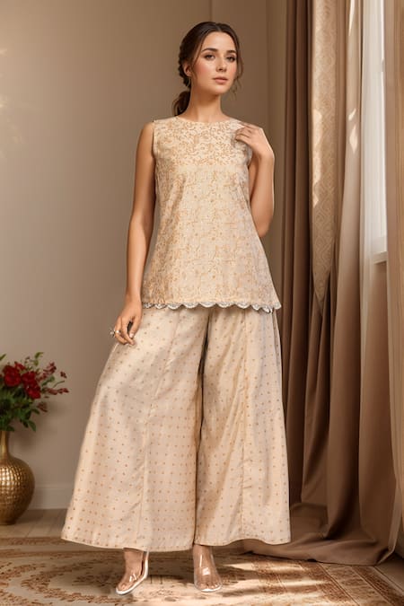 Tan kurta featuring floral and geometric prints with scalloped lace work on the border. Paired with a panelled palazzo with a half elasticated waistband.