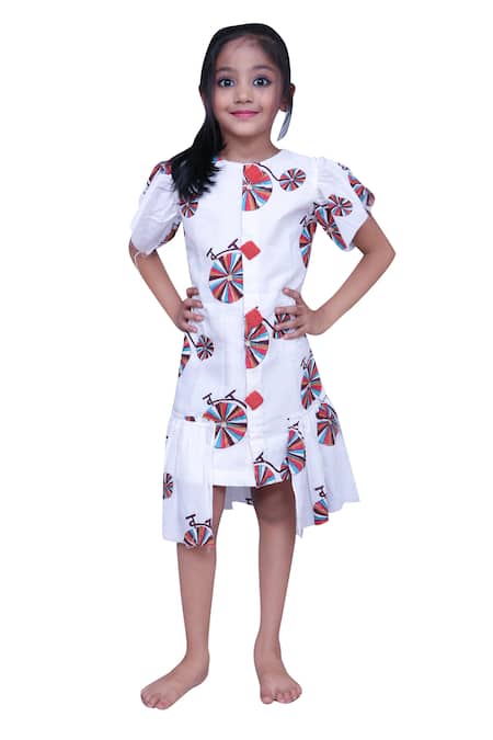 White dress featuring cycle print with frill details on the sleeves and hem
