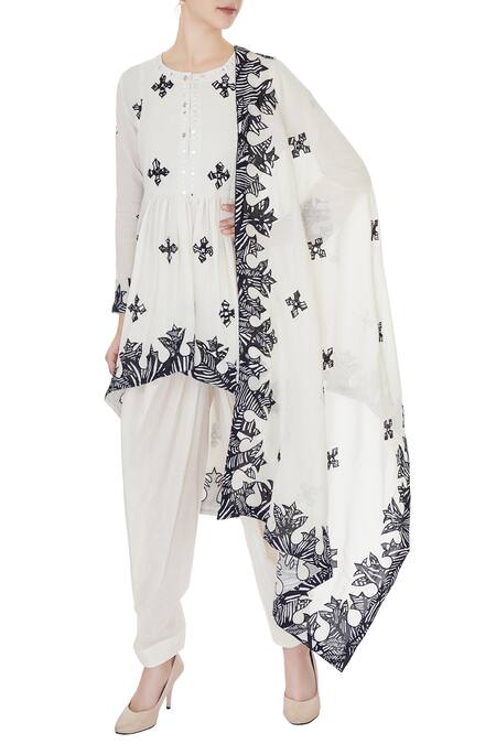 Perfectly contemporary and minimal with a traditional twist, this ivory and black short high low kurta is a great to flaunt. It is teamed up with flowy dhoti patiala pants and a dupatta. Abstract printed patchwork detailing adorns the kurta and dupatta.