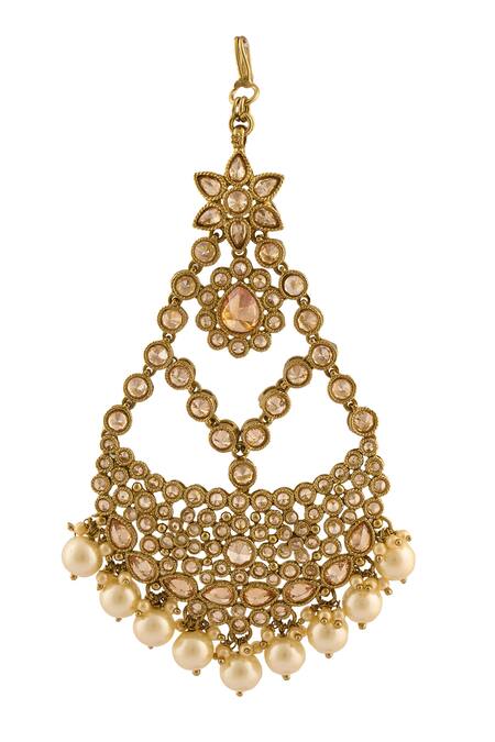 Gold tone passa with Mughal shape, floral cut work pattern, encrusted stones & pearl drop tassel details.