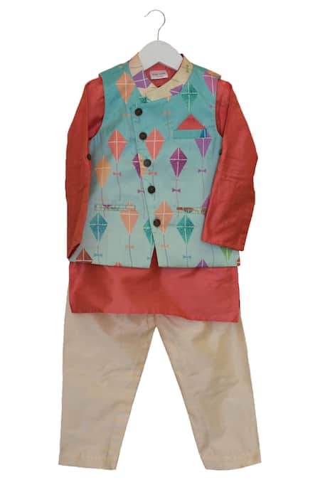 A playful quirk of print & popping out colors in this well-crafted ensemble will make him look absolutely adorable for the occasion.