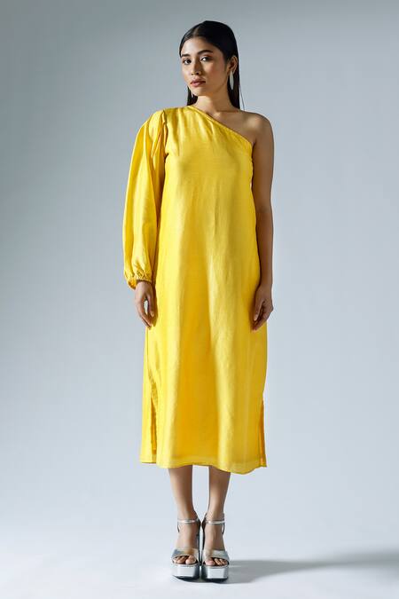 Yellow silk dress featuring a one shoulder design with a full pleated balloon sleeve