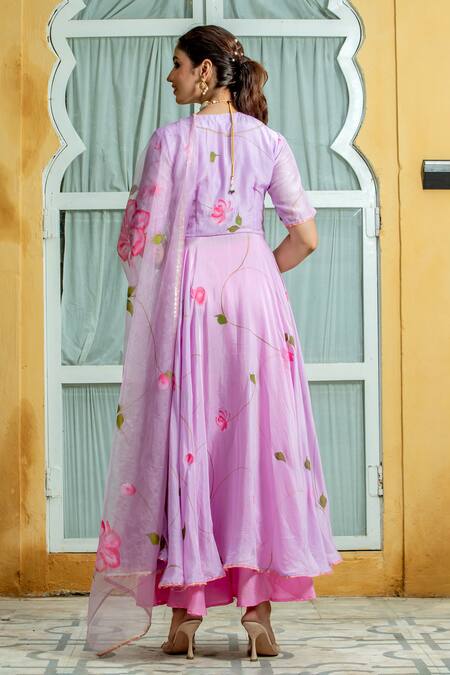 Lavender front-slit anarkali featuring hand painted floral designs. Paired with a coordinating palazzo and a zari laced dupatta.