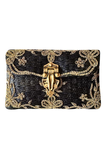 Black rectangular-shaped clutch featuring hand embroidered floral motif zardozi work