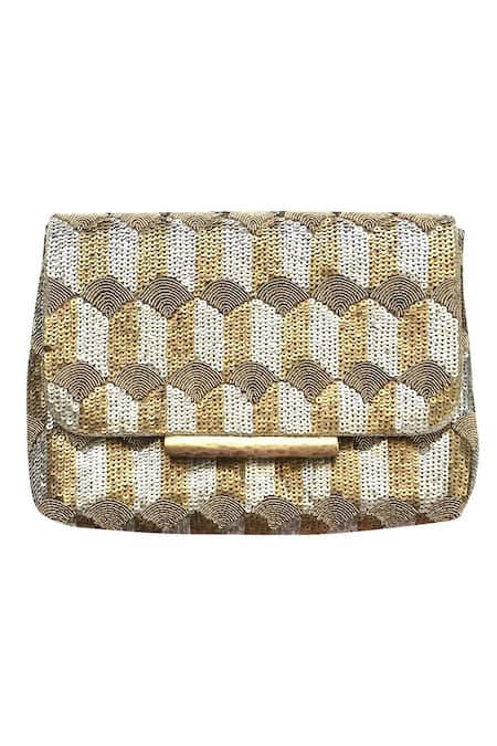 Gold embellished flap clutch featuring hand embroidered scallop motif sequins and quilted silk lining