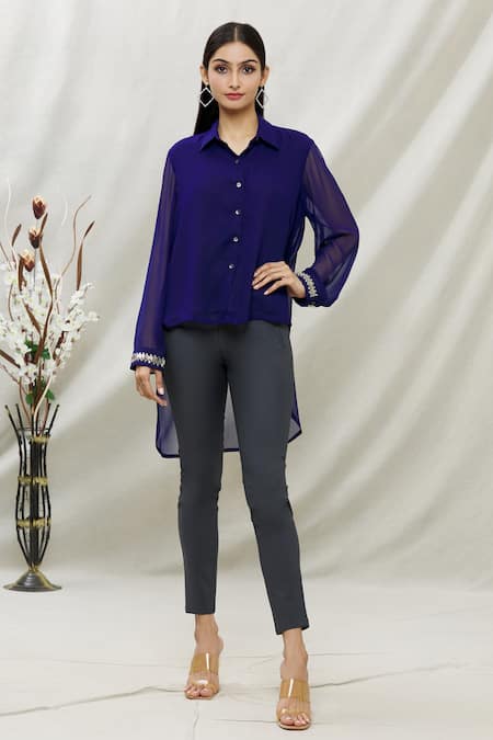 Blue Georgette Embellished Stone Spread Collar High Low Hem Tunic