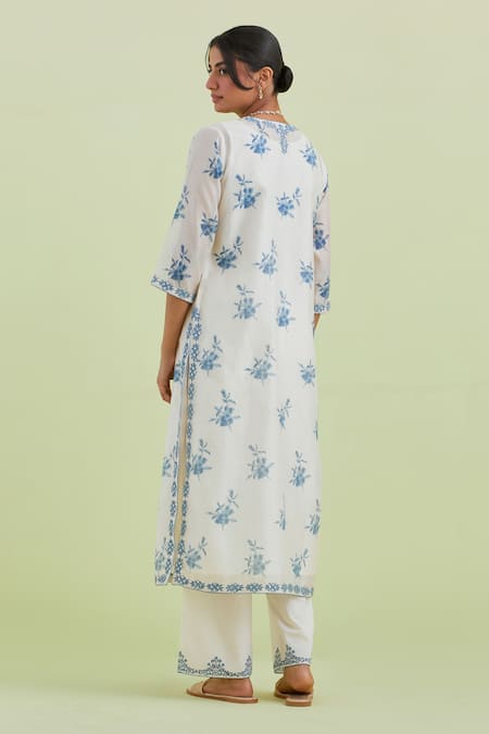 Off white straight kurta featuring hand block print with blue thread and mirror embroidery at the neckline. Paired with an off white straight pant with printed hem, slip, and a matching dupatta.