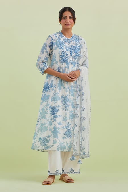 Blue floral embroidered kurta featuring a round neckline and three-quarter sleeves. Paired with off white pants and a matching dupatta with printed details.