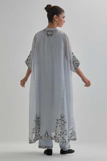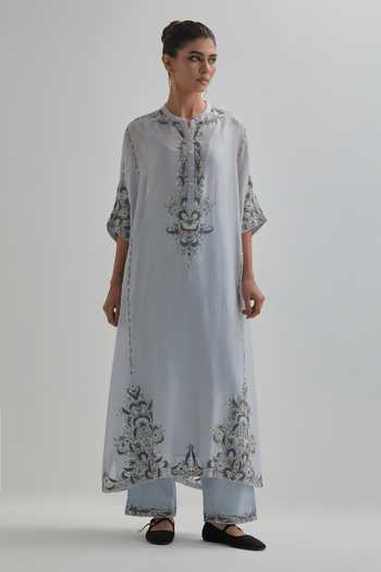Blue Silk Chanderi easy fit kaftan with earthy coloured thread Aari embroidery, highlighted with silver sequins work. It has a round collar neck with a button placket in the front and comes with a matching cotton slip. Paired with Blue silk Chanderi straight pants with earthy coloured Aari work at hem, the pants have an elasticated back, drawstring and side pockets.