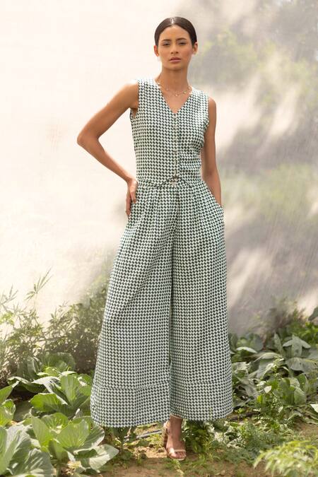 Green Cotton Rayon Printed Houndstooth V-neck Savannah Top With Pant