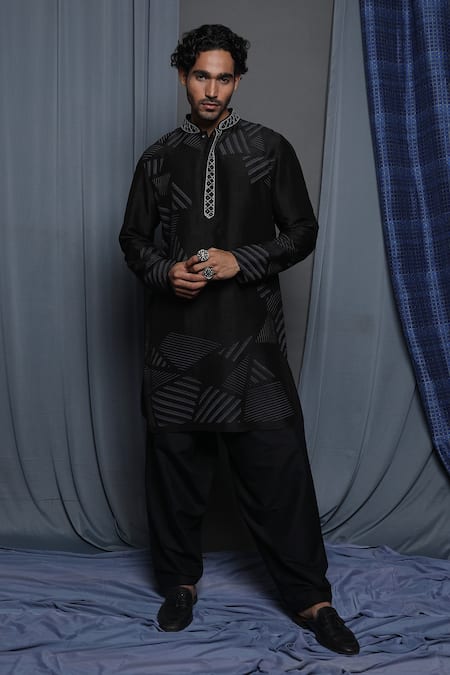 Buy_Krishna Mehta_Black Tussar Printed Stripe Kurta _Online_at_Aza_Fashions