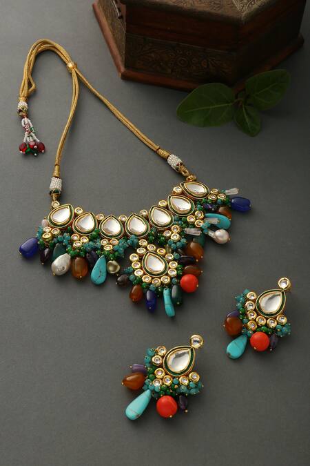 22k gold plated choker with encrusted kundan & multicolor stone drops. Comes with a pair of kundan danglers