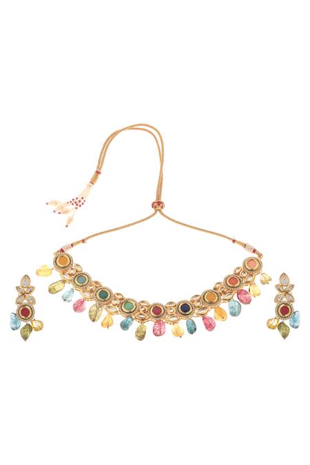 22K Gold plated choker with navratan kundan studded & embellished with multicolored stones. Paired with a pair of earrings.