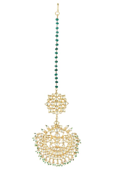 Gold maangtikka featuring intricate kundan floral and circular motifs