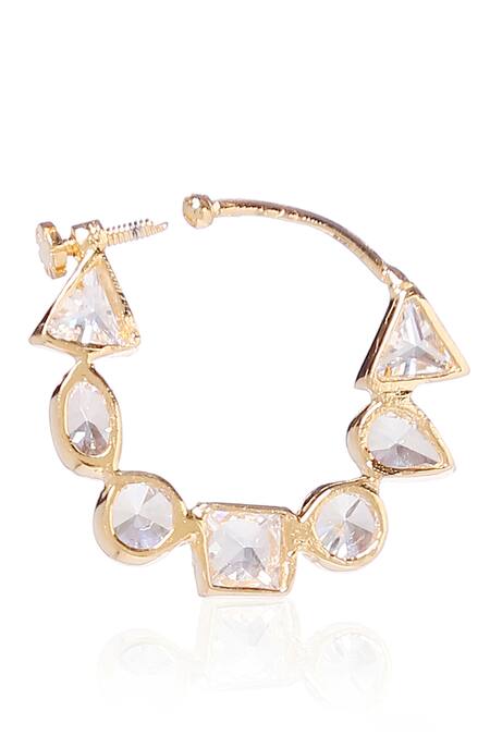 Gold plated nose ring with encrusted geometric motif kundan stones.