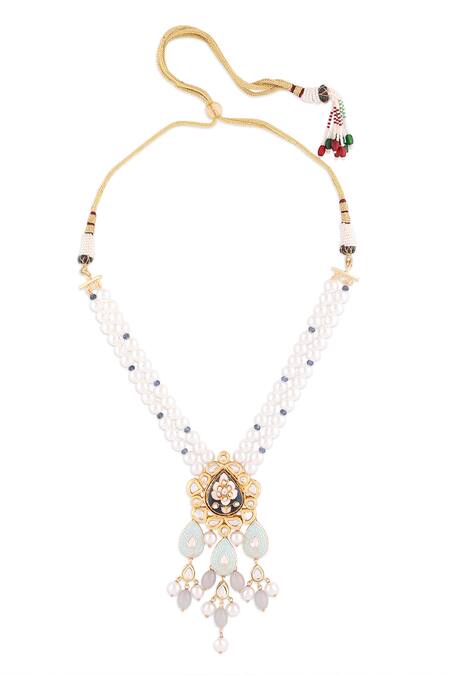 Gold polish necklace with double pearl string, agate & kundan polki embellishments. Comes with earrings.