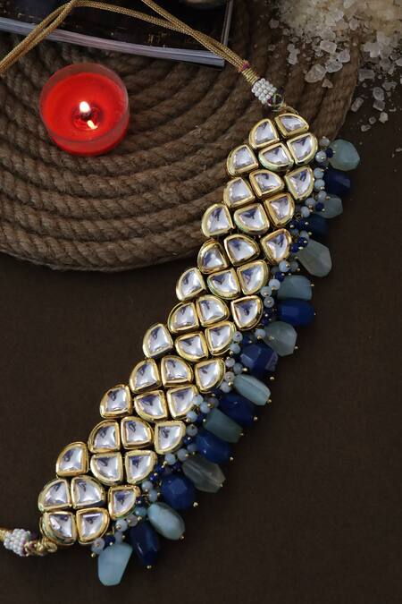 Gold-plated handmade choker with encrusted high-grade kundan, blue cluster stone drops & geometric motifs.